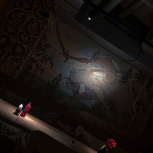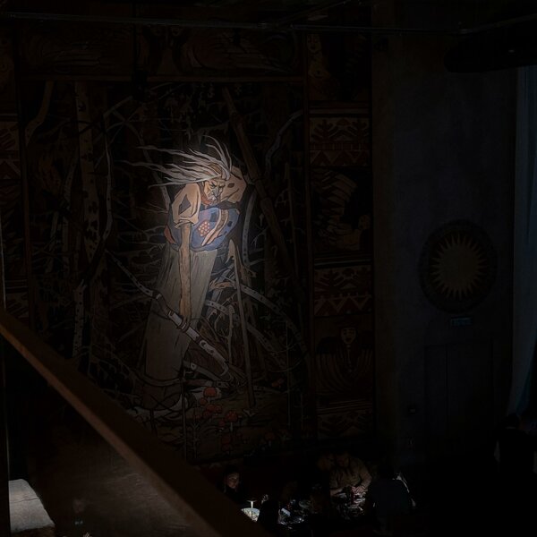 Конечно хочется отметить доброжелательный коллектив сотрудников, прекрасное лицо ресторана. Официанты отлично знают все блюда, с нами работал Дмитрий. Всегда в зоне видимости и не стоят пустые тарелки дольше 2-3 минут на столе при посадке 80-90%. Посадили нас за столик на 2 этаже. Антураж вау, росписи на стенах, длинный деревянный стол с миской яблок— очень красиво. Аутентичная музыка народных мотивов на современный лад подстать общему образу заведения.