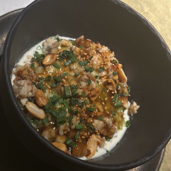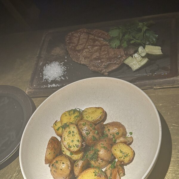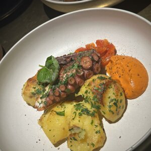 Тар тар из говядины отличный, разве что икра там — дело вкуса, но будто не вписалась. Тар тар из угря со страчателлой не понравился, сами продукты отличные, но их тандем не показался интересным. Стейк выше всяких похвал. Осьминог неплохой, но соусы из (вроде моркови) и картофель тоже друг с другом не дружили совсем. Десерт с орешками и ягодами замечательный. А вот сметанник ни разу не похож на сметанник… невероятно приторный, не чувствуется вкуса никакого кроме ядерной сладости и